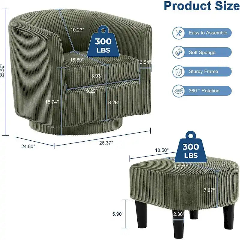 Stability and Safety Swivel accent chair with ottoman designed with a robust metal disc base and solid wooden frame, this corduroy accent chair ensures it wont tip over, providing reliable support for up to 300 pounds