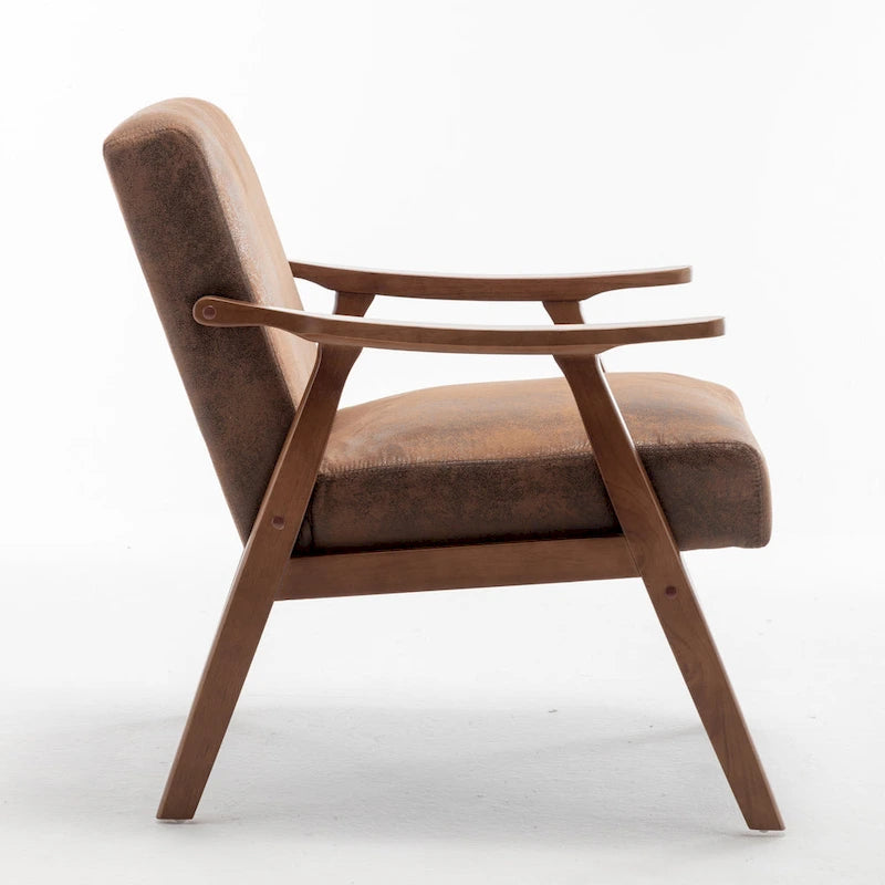 Add a touch of vintage charm to your living space with the Cedrice Microfiber Accent Chair. Crafted from solid wood in medium espresso finish, this mid-century modern piece features an attractive open-framed arm design and rounded wooden bolt covers for an authentic retro look. The chair is upholstered in leather-look microfiber and has plush foam cushioning to ensure maximum comfort and relaxation.