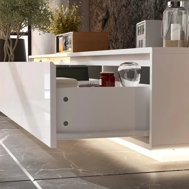 Elevate your living space with our sleek and modern High Gloss White TV Stand with LED Lighting. This contemporary entertainment unit is designed to complement any decor, offering both functional storage and a touch of elegance to your home. The clean white high gloss finish reflects light, brightening your room while maintaining an uncluttered look.