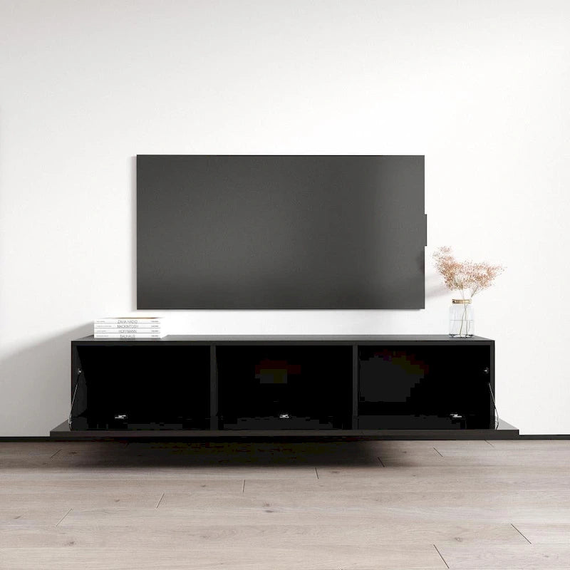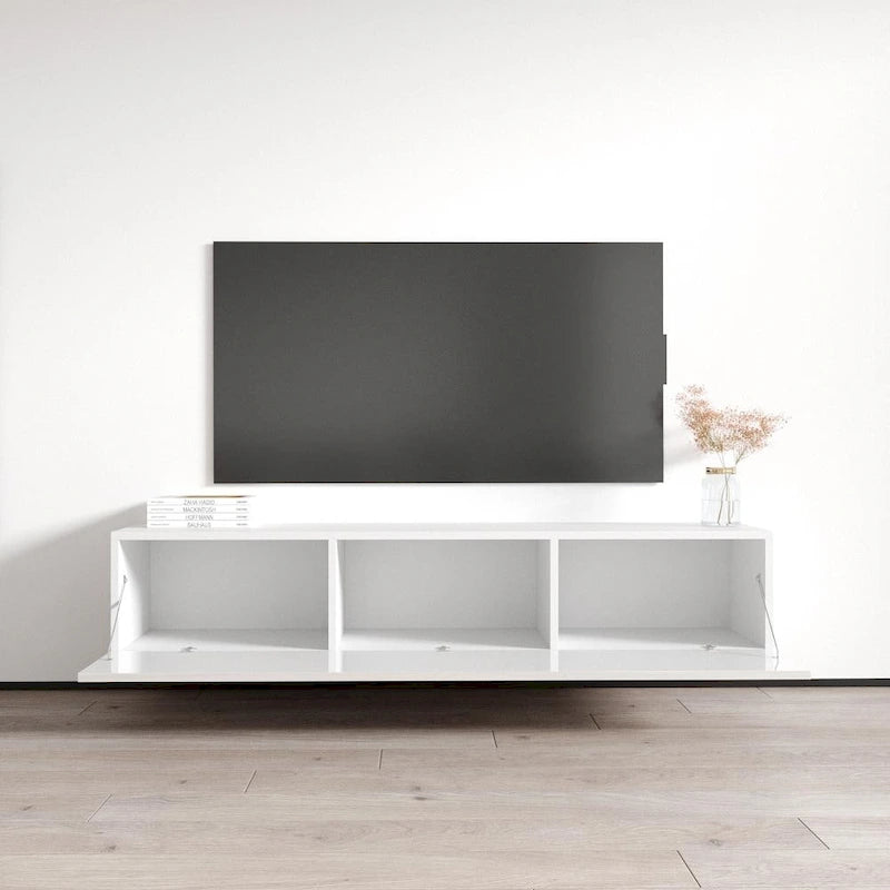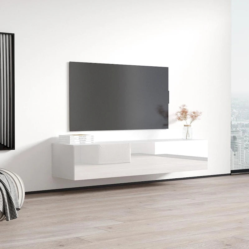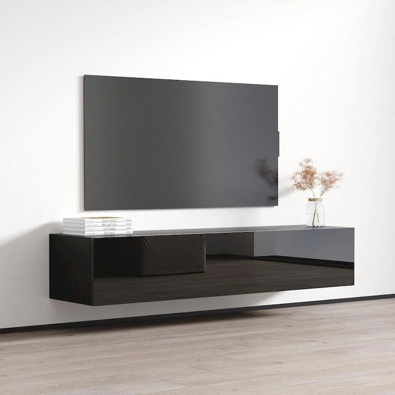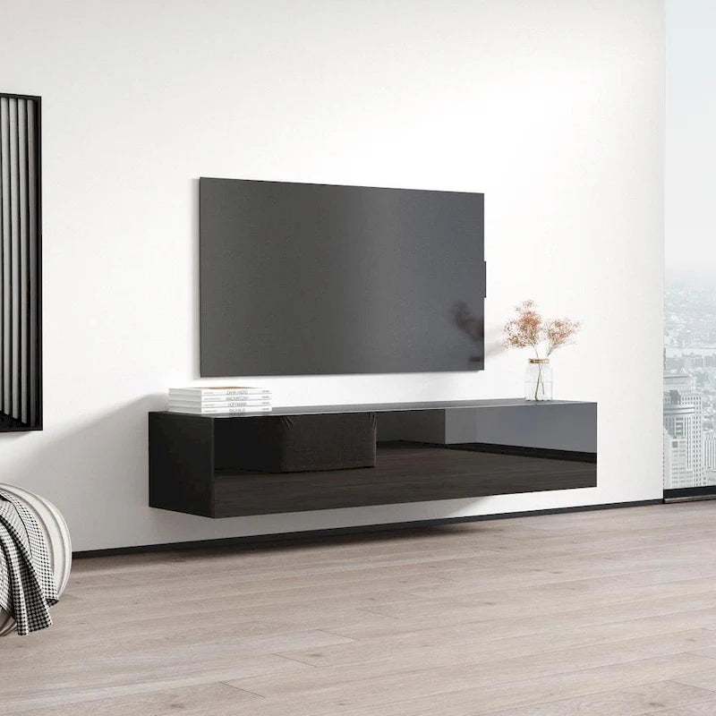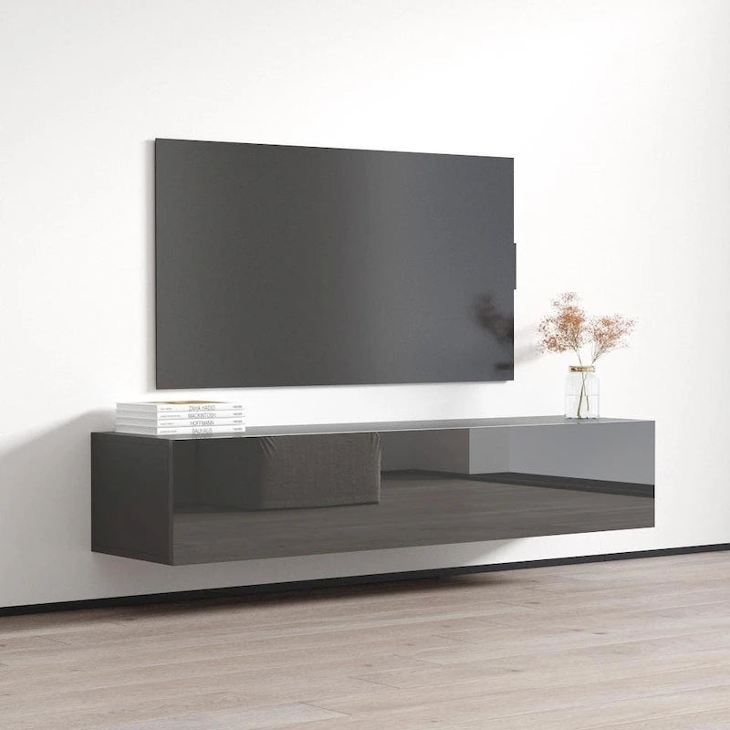 Update your entertainment unit with this wall-mounted 63-inch TV stand. This TV stand fits up to 70-inch TV's and has a high gloss front with a matte body. It boasts a modern and unique contemporary design and will allow for plenty of living room storage space.