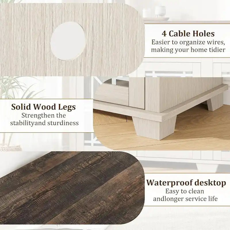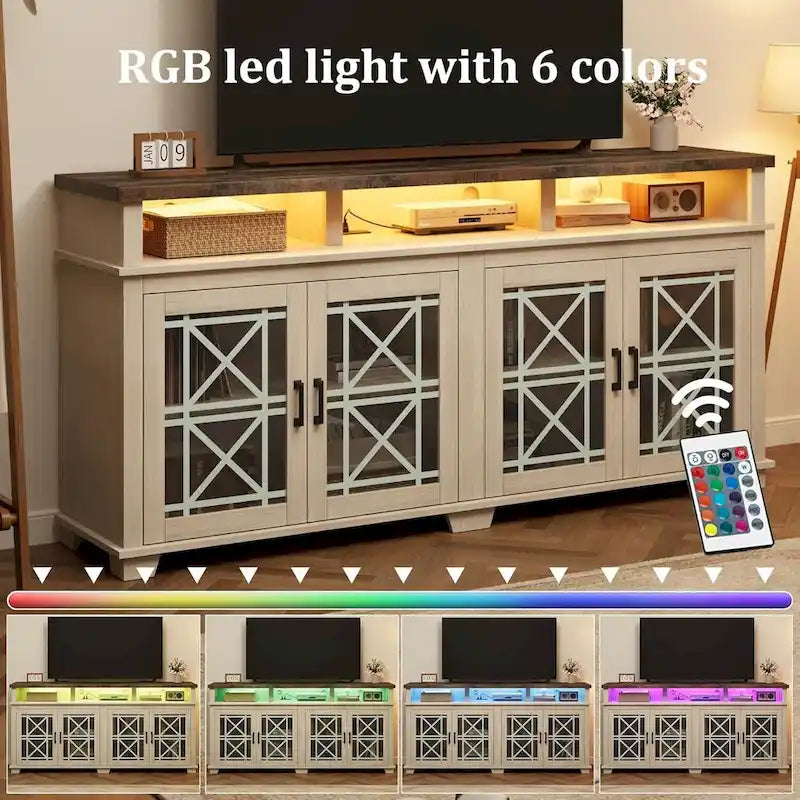 CHIC DESIGN: This TV stand perfectly combines the led entertainment center with the glass door, Perfectly integrates farmhouse style into this TV stand. The media cabinet door combines the glass door design with the Pattern, with simple lines and natural tones, it can easily integrate into your life and is suitable for most decorative stylesDIMENSION: The TV console cabinet overall size is 70.9 L x 15.7 W x 34.1 H, it is suitable for TVs up to 80 inches. Five independent storage spaces provide you with ample storage space, and the design of the pattern glass door allows you to divide the hidden or display area as neededFEATURES: The entertainment center of our TV stand is equipped with LED lights, a total of 6 colors for you to use, it's making your TV stand can also play a better role at night. The unique print design on the glass door makes this TV cabinet look even more beautiful, adding a touch of charm to your homeSTURDY STRUCTURE: The TV stand is made of high-quality MDF-engineered wood, ensuring its strength and durability. The 30mm thickened waterproof desktop provides excellent stability and a load-bearing capacity of up to 220 pounds. The shelf is designed to bear 25 pounds, providing ample supportEASY ASSEMBLY: This product is very simple to assemble thanks to clear step-by-step instructions in the installation manual. All screws and parts are labeled for easy assembly. Your farmhouse TV stand will be carefully packed to ensure maximum protection during shipping