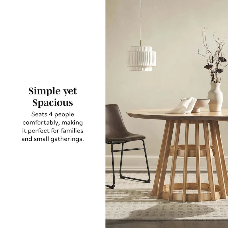 Tuck this 48 inch diameter table into your small-space kitchen and still fit four people comfortably (or pull up that high chair if baby wants to feel part of the fam). The slatted wood, solid pine pedestal base gives you plenty of legroom, whether you're gathering for a meal or setting up your favorite game of cards.